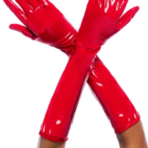 Rote Vinylhandschuhe. Enthält einen Kordelzug oben für eine verstellbare Passform. Zusammensetzung: 96% Polyester 4% Elasthan. Vorsichtsmaßnahmen: Separat von Hand waschen, nicht im Trockner trocknen, keine Bleichmittel verwenden.