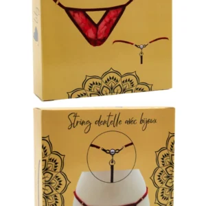 + Free ShippingIhr Großhändler für Dropshipping von sexy Dessous bietet Ihnen diesen String mit Perlen- und goldenen Strasssteinen, roter Spitze – String aus der Be lily Lingerie Kollektion.