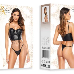 Ensemble sexy en matière noire wetlook. Le haut court – corset a désossage dans les tasses et laçage décoratif à l?avant.Des bretelles réglables et une fermeture à crochet permettent un ajustement parfait à la silhouette. Les culottes classiques sont également réglables.L?ensemble est parfait non seulement pour la chambre à coucher, mais aussi pour les styles quotidiens.L?ensemble est livré dans un emballage élégant avec une photo représentant le produit. Taille : S/M et L/XLTaille S/M : (Seins : 81-91 cm, B-C, Taille : 56-71 cm, Hanche : 85-97 cm)Taille L/XL : (Seins : 91-107 cm, C-D, Taille : 71-91 cm, Hanche : 97-112 cm)Matière : 92% polyamide, 8% élasthanne