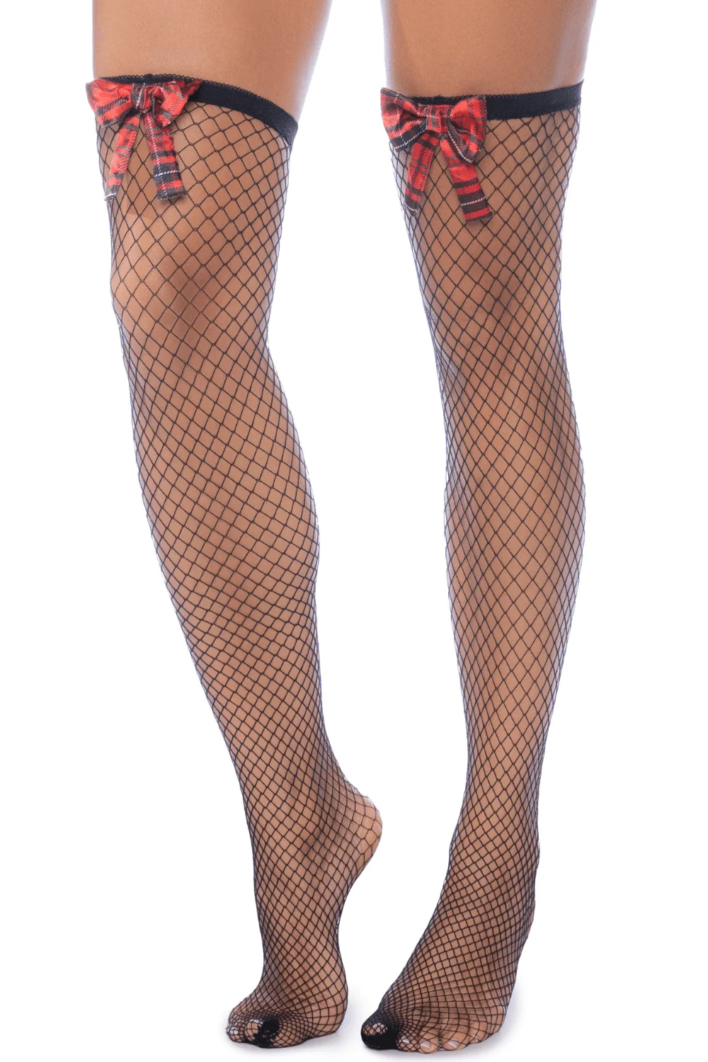 + Free ShippingSchwarze Netzstrümpfe mit großen Maschen und roten Schleifen im Schottenmuster von Ihrem Anbieter Mapalé, Großhandel für sexy Dessous.