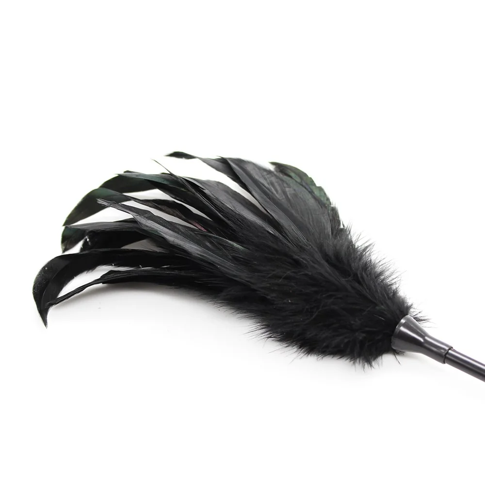 Es wird sicherlich Schläge mit dieser schwarzen Klatsche geben. Nach der Bestrafung kommt die Zeit der Zärtlichkeiten und der Sanftheit mit den schwarzen Federn. Schwarze Klatsche von 48 cm, eine Seite zum leichten Schlagen und die andere Seite zum Streicheln mit diesen Federn. Feder und PVC.
