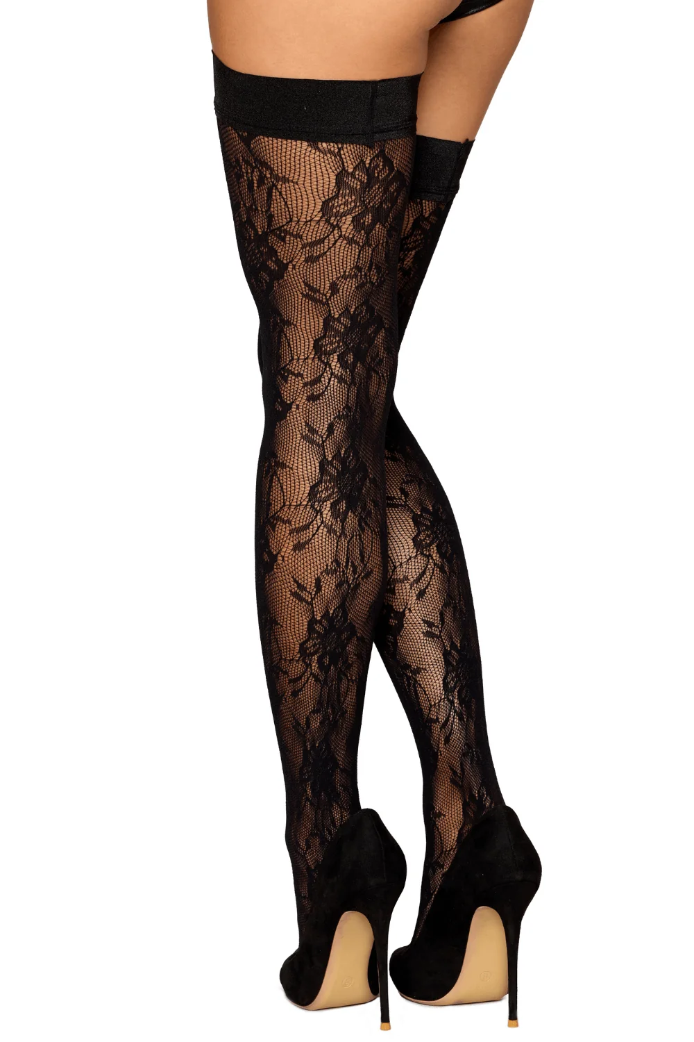 Schwarze, selbsthaftende Fantasie-Strümpfe mit elastischem Strumpfband und Silikonband. Materialien: 90% Nylon, 10% Spandex