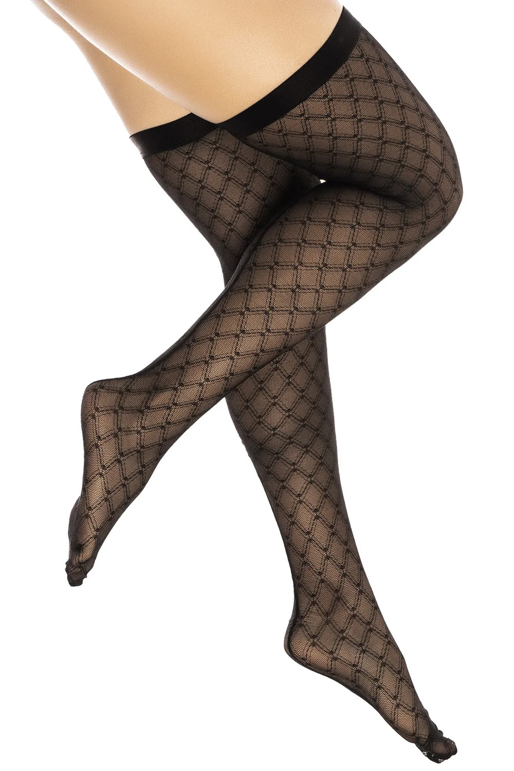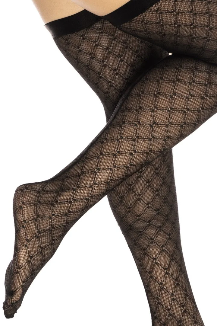 Transparente Netzstrümpfe, geometrischer Druck mit elastischem Band am Oberschenkel für den Halt. Ohne Mäßigung zu tragen. Zusammensetzung: 94% Polyamid 6% Elasthan