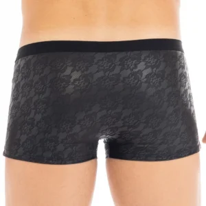 Superbe schwarzer sexy Boxer aus Kunstleder für Herren mit Spitzenmuster aus der Pleasure-Kollektion, Marke LOOKME. Materialien: 80 % Polyamid / 20 % Elasthan