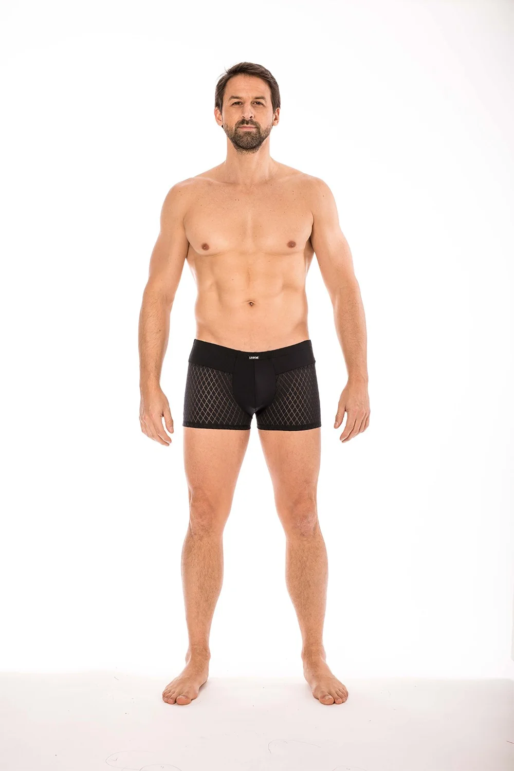 Schwarzer Boxer mit seinem Stil, breitem Bund und im unteren Bereich, durchbrochenem Stoff in Rautenform, der diesem schwarzen Boxer der Marke LOOKME seinen ganzen Charme und seine Noblesse verleiht. Aus einem weichen und bequemen Stoff. Zusammensetzung: 80% Polyamid 20% Spandex
