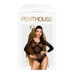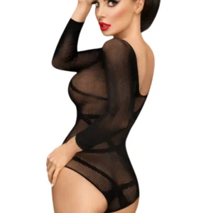 Schwarzer Body mit langen Ärmeln aus transparentem Netz mit undurchsichtigen schwarzen Streifen im Riemchenstil. Rundhalsausschnitt – Rückenfrei mit Öffnung im Schritt. Langärmeliger Body aus transparentem Netz. Öffnung im Schritt aus der Penthouse-Kollektion. Zusammensetzung: 92 % Nylon – 8 % Elasthan