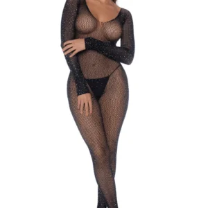 Tauchen Sie ein in Eleganz und Glamour mit diesem schwarzen Netz-Overall mit langen Ärmeln, veredelt durch funkelnde Strasssteine. Entworfen, um die Silhouette zu umschmeicheln und gleichzeitig einen spektakulären Effekt zu bieten, ist er ideal für besondere Abende oder um Ihrem Outfit eine kühne Note zu verleihen.