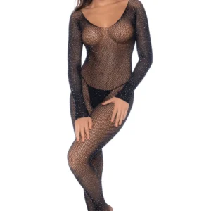 + Free ShippingLangärmeliger Netz-Overall in Schwarz mit Strassverzierungen und offenem Schritt von Ihrem Lieferanten Mapalé, Großhandel für sexy Dessous.