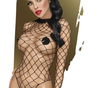 So Sexy, dieser schwarze Body mit seinem weitmaschigen Netz in einem elastischen Material, das Ihre Kurven umschmeichelt. Schwarzer Body aus grobem Netz, im Schritt offen, mit langen Ärmeln aus der Penthouse-Kollektion. Zusammensetzung: 92 % Nylon – 8 % Elasthan