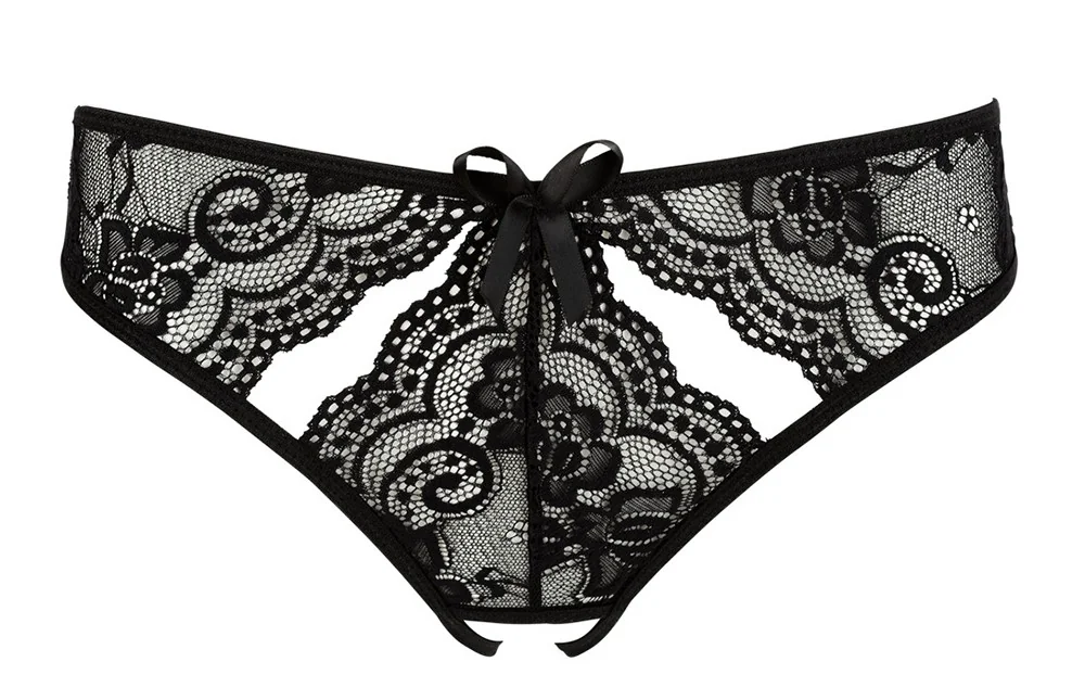 Spitzenhöschen mit offenem Schritt im floralen Design. 90% Polyamid, 10% Elasthan.