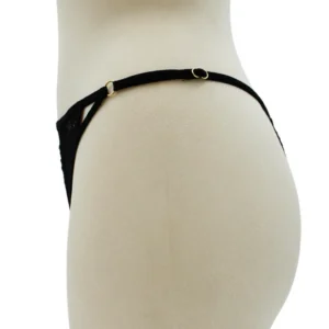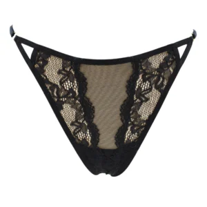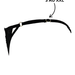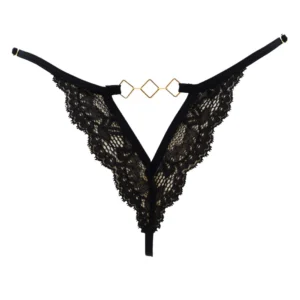 Eleganz und Sinnlichkeit vereinen sich in diesem schwarzen Tanga aus raffinierter Spitze, der die Kurven mit Leichtigkeit und Raffinesse betont. Die offene Rückseite wird durch ein Schmuckdetail mit goldenen Rauten veredelt, das eine kostbare und glamouröse Note hinzufügt. Die verstellbaren seitlichen Träger sorgen für perfekten Halt und bieten gleichzeitig einen minimalistischen und ultra-sexy Look.