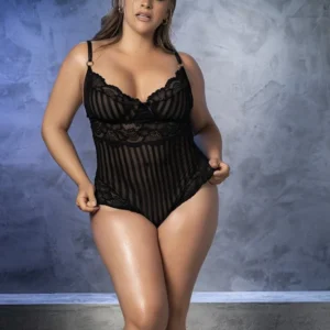 Wunderschöner schwarzer Spitzenbody, für Frauen, die große Größen suchen, gestreift in Spitze und feinem Netz, von der Marke Mapalé. Verstellbare Träger, Hakenverschluss, verstellbar, am Rücken. Verschluss im Schritt. Zusammensetzung: 88% Nylon 12% Elasthan