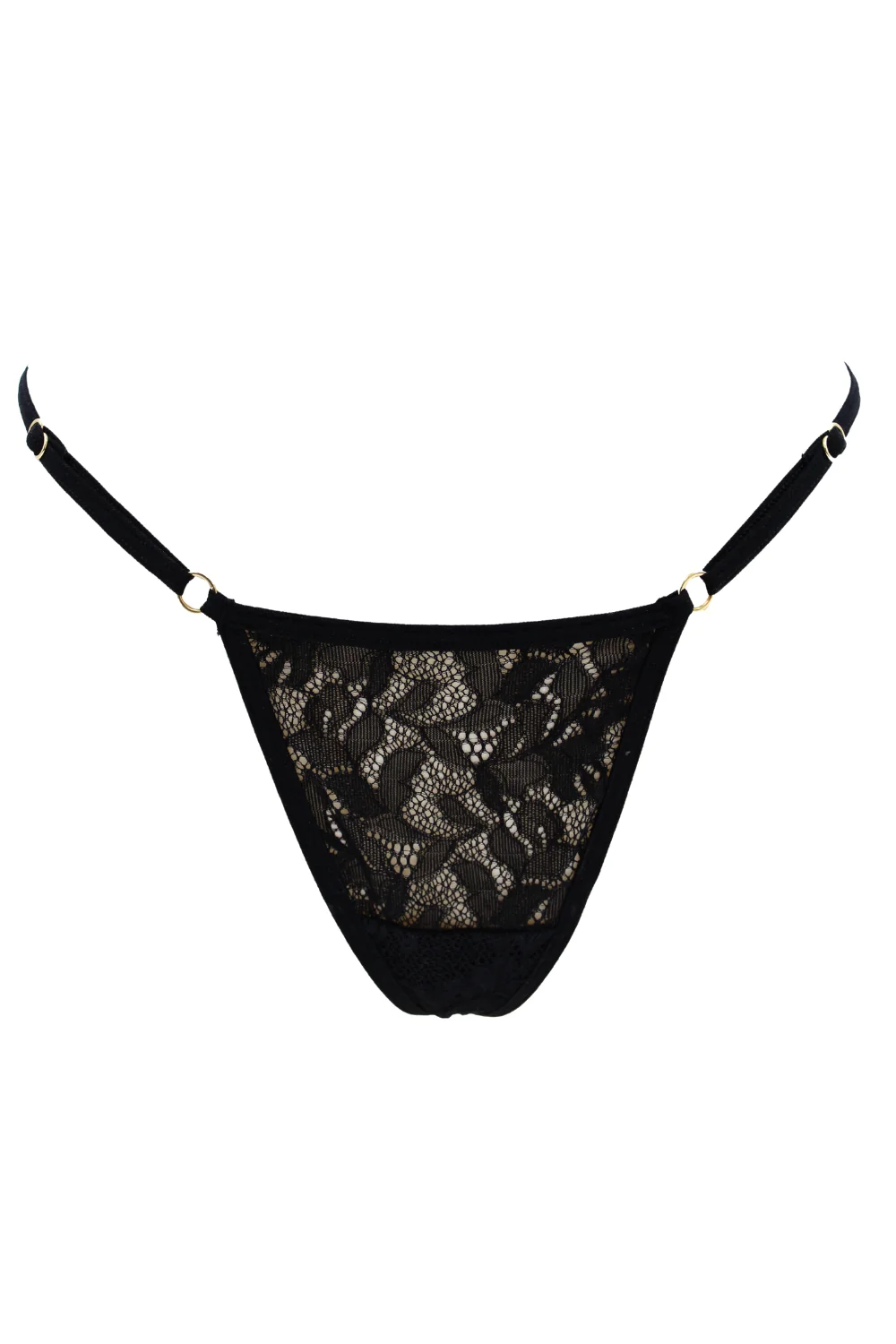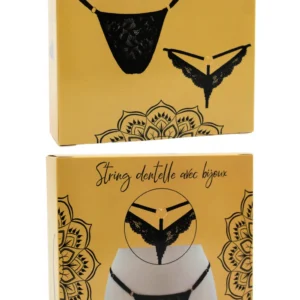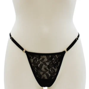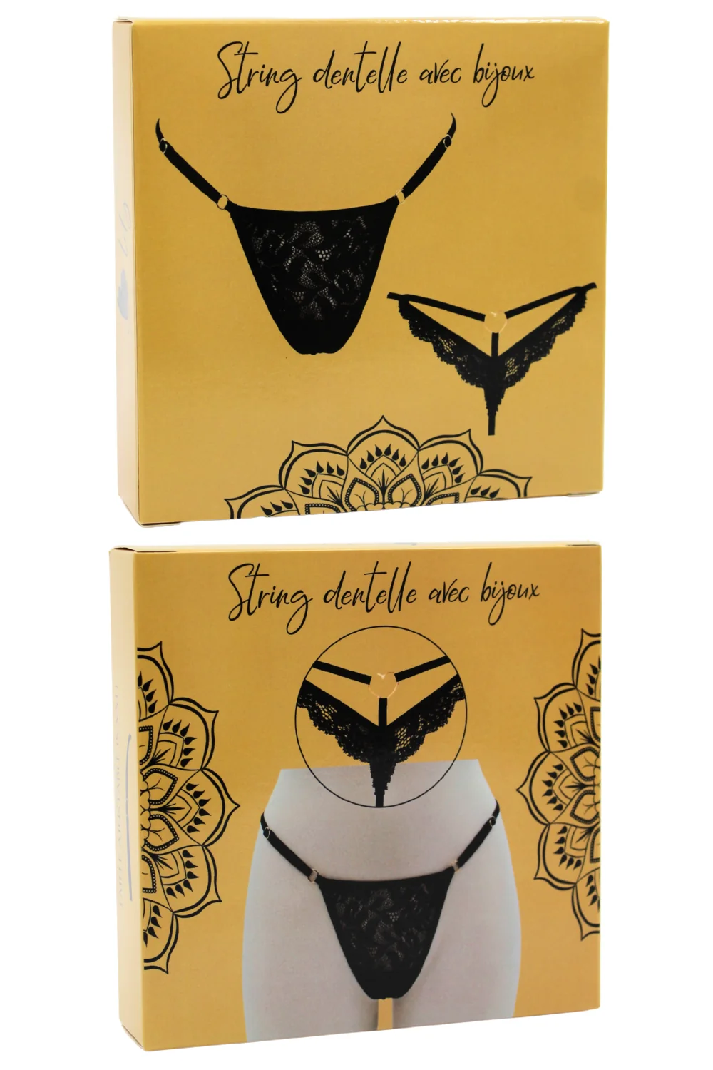 Betonen Sie Ihre Sinnlichkeit mit diesem schwarzen String aus feiner Spitze, veredelt durch ein goldenes Herz-Juwel-Detail auf der Rückseite, das eine romantische und glamouröse Note verleiht. Sein durchbrochenes Design und die verstellbaren Riemen betonen die Silhouette und bieten gleichzeitig eine perfekte Passform und optimalen Komfort.