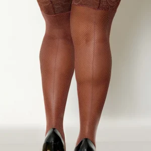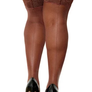 Netzstrümpfe, Kaffeefarbe, große Größe, von der Marke Dreamgirl mit Silikonspitzen in Spitze. In den oberen Spitzenbändern befinden sich Silikongummis, um einen guten Halt an den Oberschenkeln zu gewährleisten.