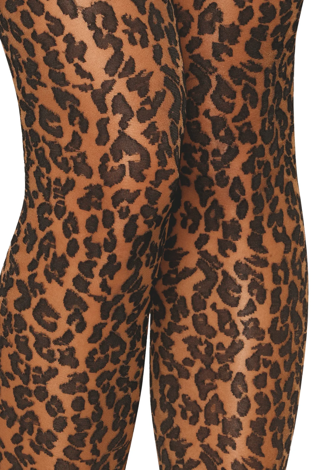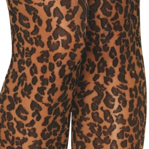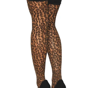Selbsthaftende Strümpfe mit Leopardenmuster. Elastisches Strumpfband mit Silikonstreifen. Materialien: 52% Polyester, 39% Nylon, 9% Spandex