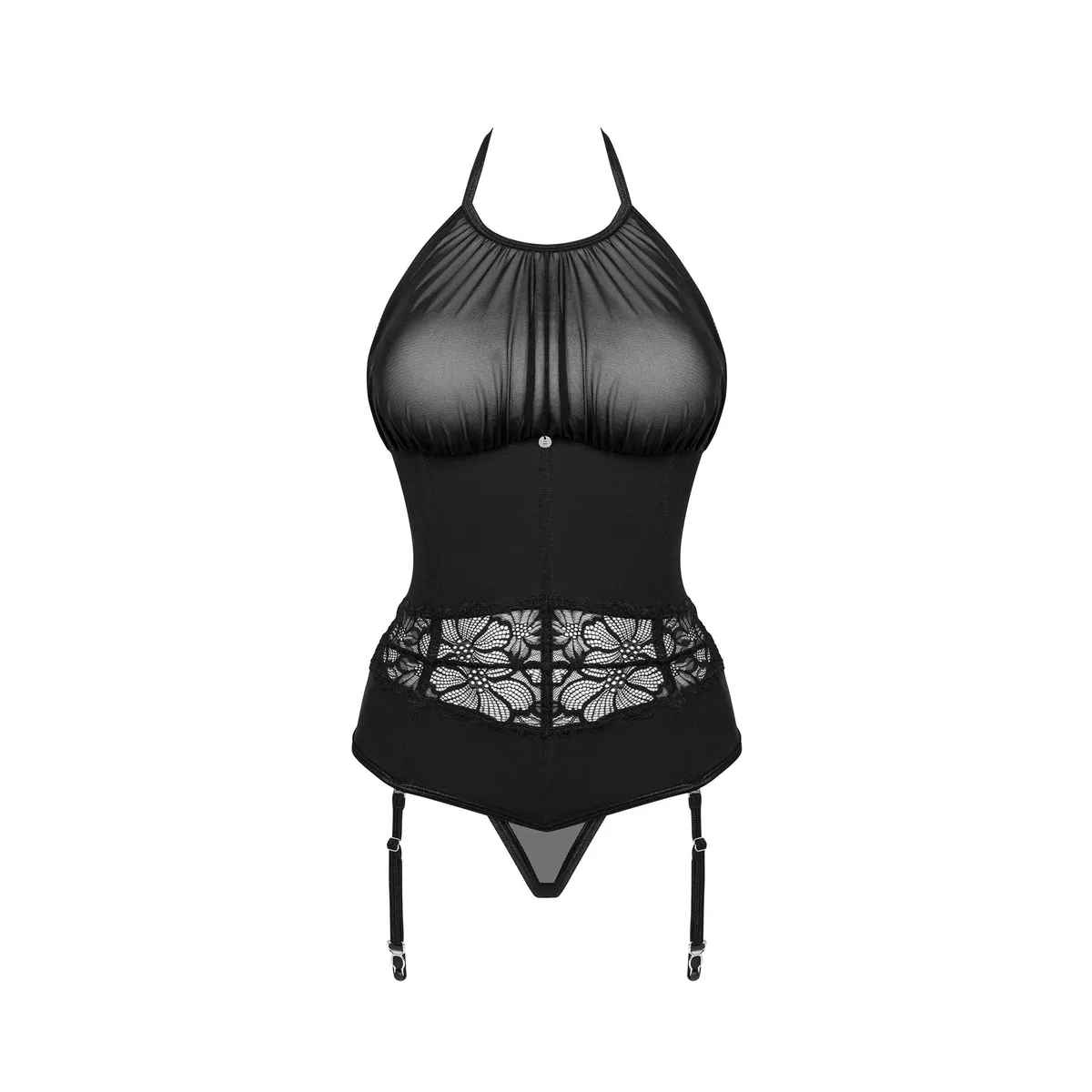 Träumen Sie von einer Dessous, die Sie gleichzeitig sündig, verführerisch und bequem fühlen lässt? Das Serafia-Korsett wird Ihre sexy Kurven betonen! Die einzigartige Materialkombination macht Sie hypnotisierend und der Halsriemen sorgt für Ihren Komfort. Tauchen Sie ein in das Vergnügen! Entdecken Sie mehr Details: – String und Korsett in Schwarz – perfekte Passform dank mehrstufigem Verschluss und verstellbaren Trägern und Strumpfhaltern – Betonung der weiblichen Kurven durch vertikale Stäbchen und Halsband – abnehmbare Strumpfhalter – glänzender Anhänger – ein minimalistisches Accessoire – eine interessante Kombination aus angenehm zu berührenden Stoffen 94 % Polyamid, 6 % Elasthan