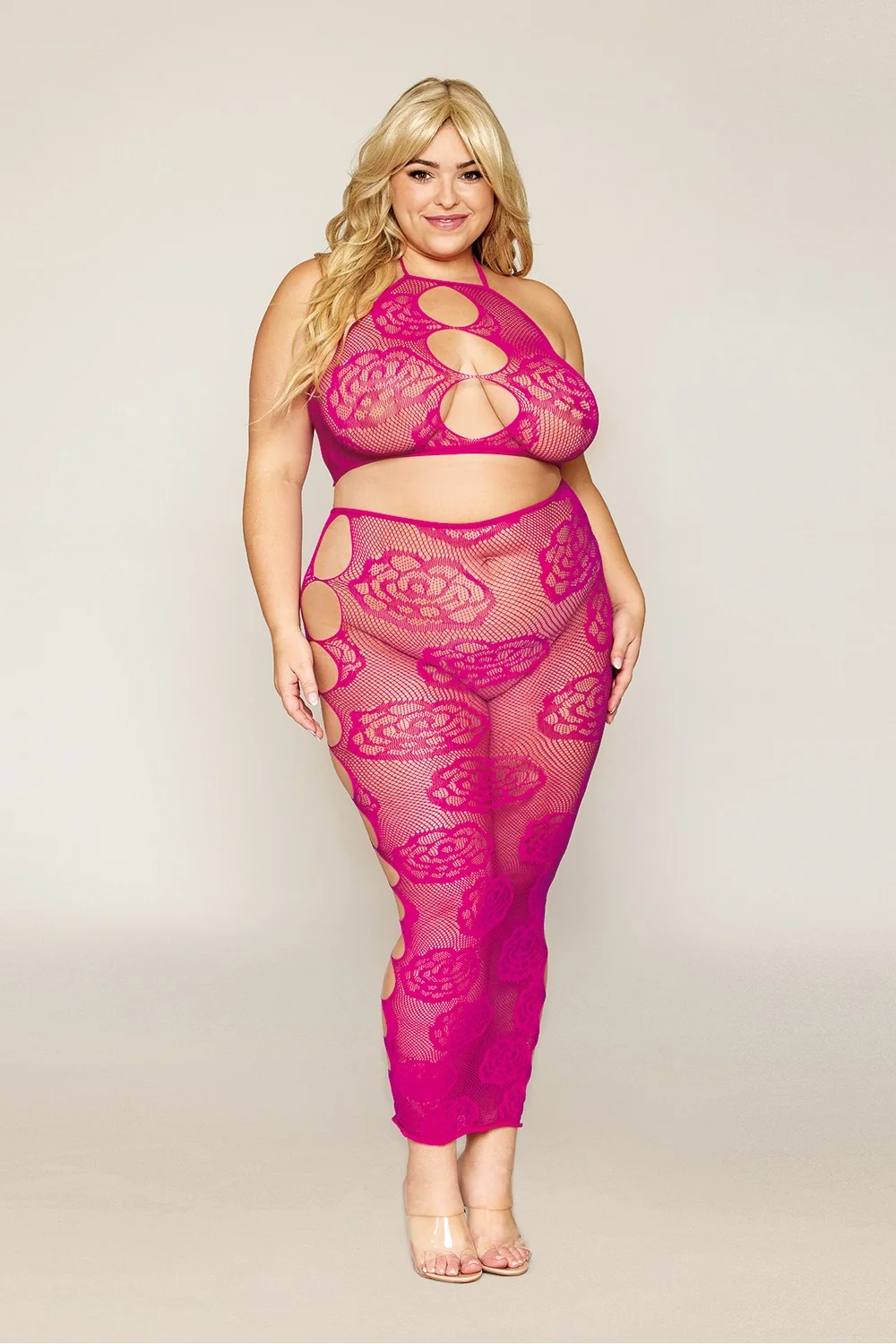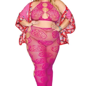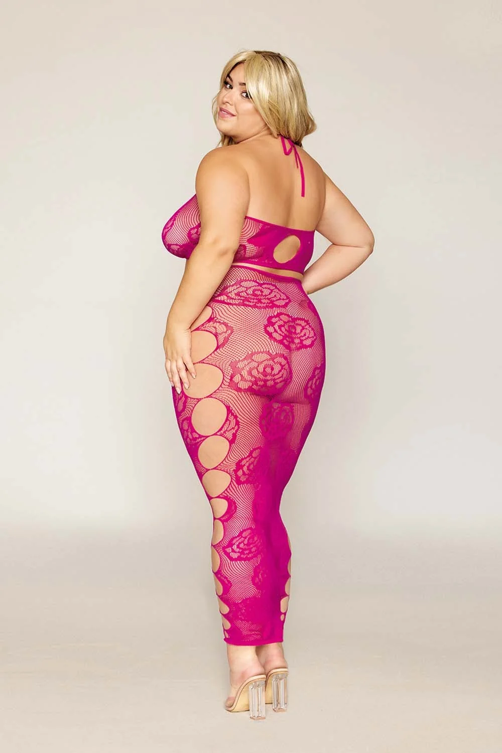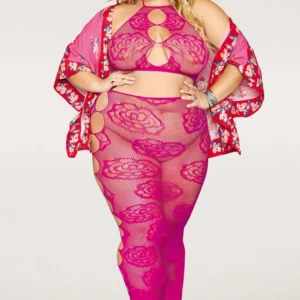 Netzunterwäsche-Set in großen Größen, bestehend aus seinem bandeauartigen BH aus rosa Netzstoff und seinem nahtlosen langen Rock mit großem rosa Muster und Netzstoff. Rückenfrei. String nicht inbegriffen. Zusammensetzung: BH/langer Rock: 93 % Nylon, 7 % Elasthan. Pflegehinweis: Separat von Hand in kaltem Wasser waschen, nicht im Trockner trocknen.