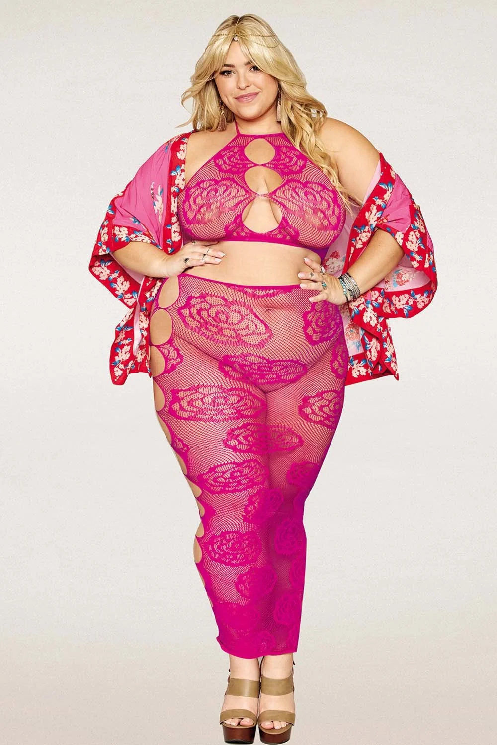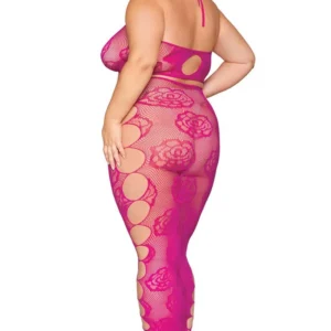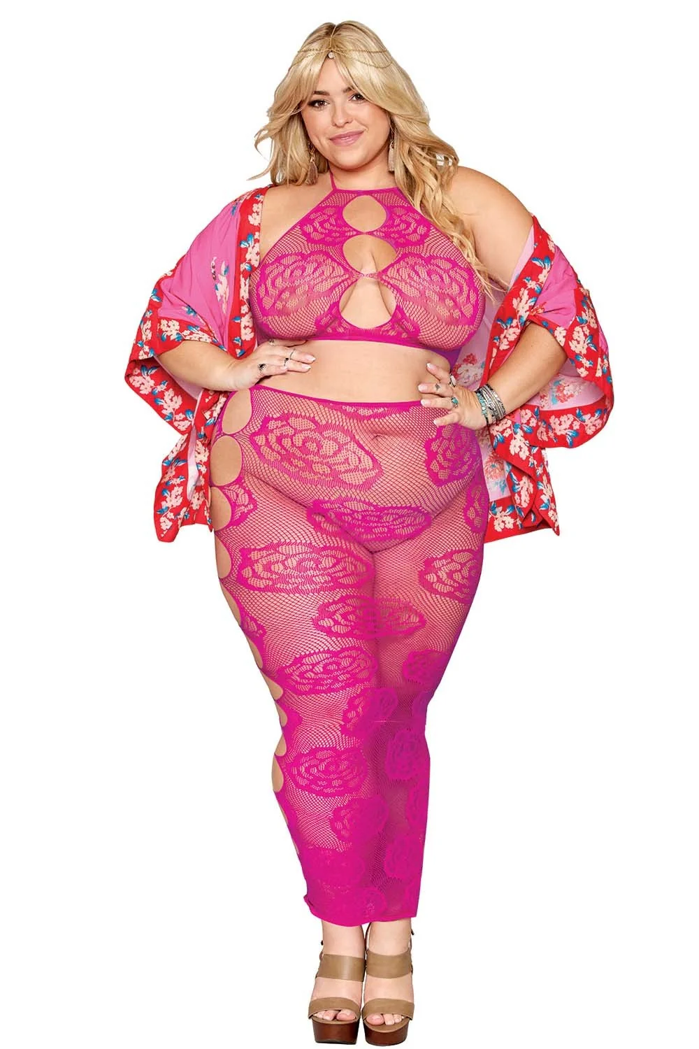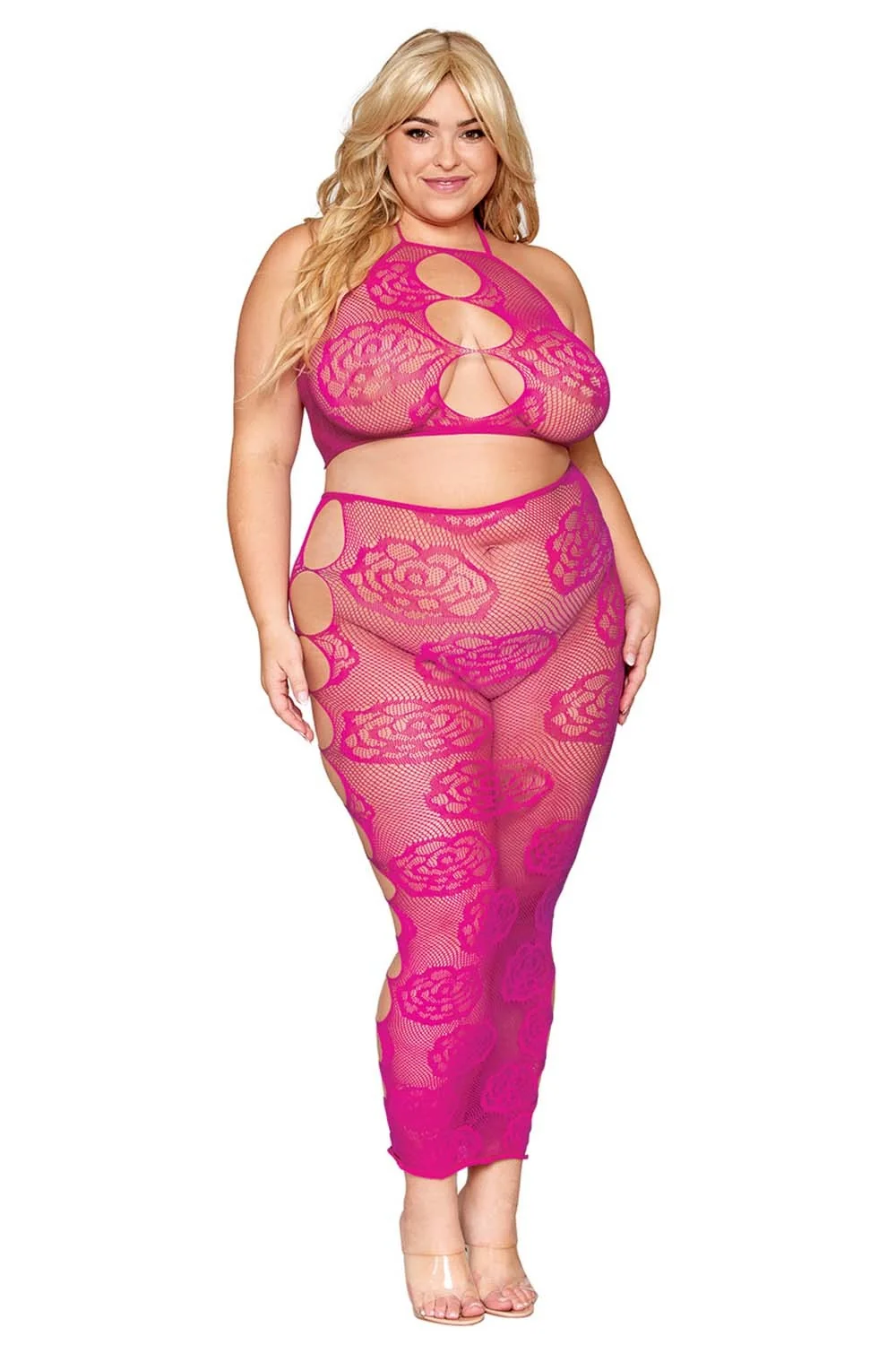 Netzunterwäsche-Set in großen Größen, bestehend aus seinem bandeauartigen BH aus rosa Netzstoff und seinem nahtlosen langen Rock mit großem rosa Muster und Netzstoff. Rückenfrei. String nicht inbegriffen. Zusammensetzung: BH/langer Rock: 93 % Nylon, 7 % Elasthan. Pflegehinweis: Separat von Hand in kaltem Wasser waschen, nicht im Trockner trocknen.