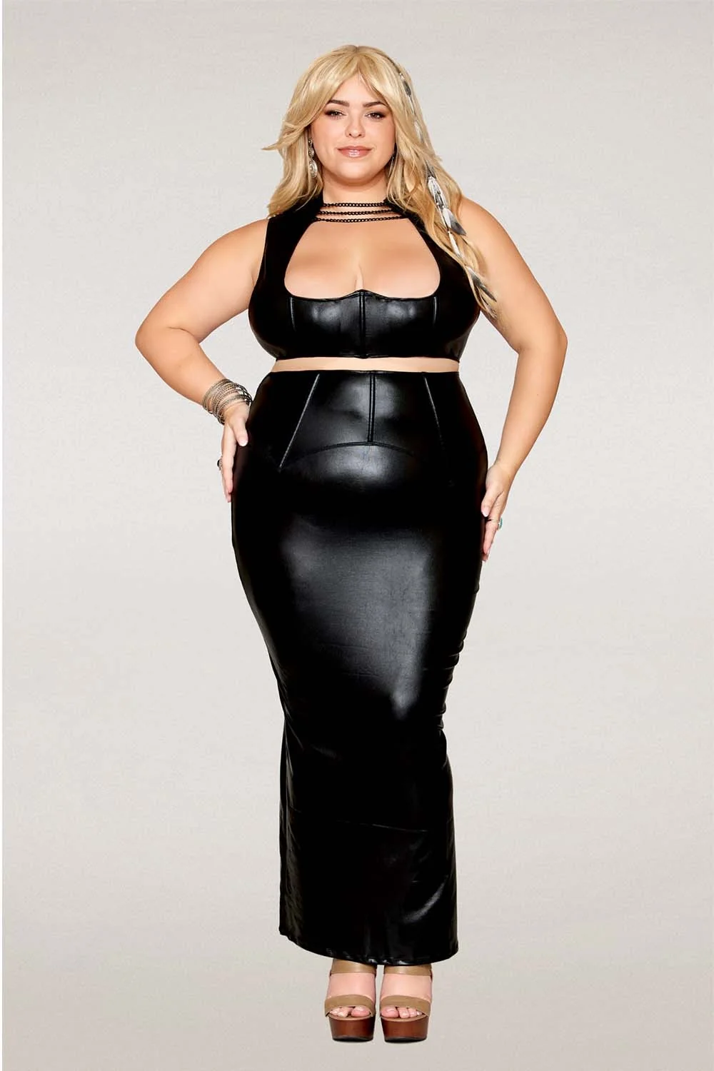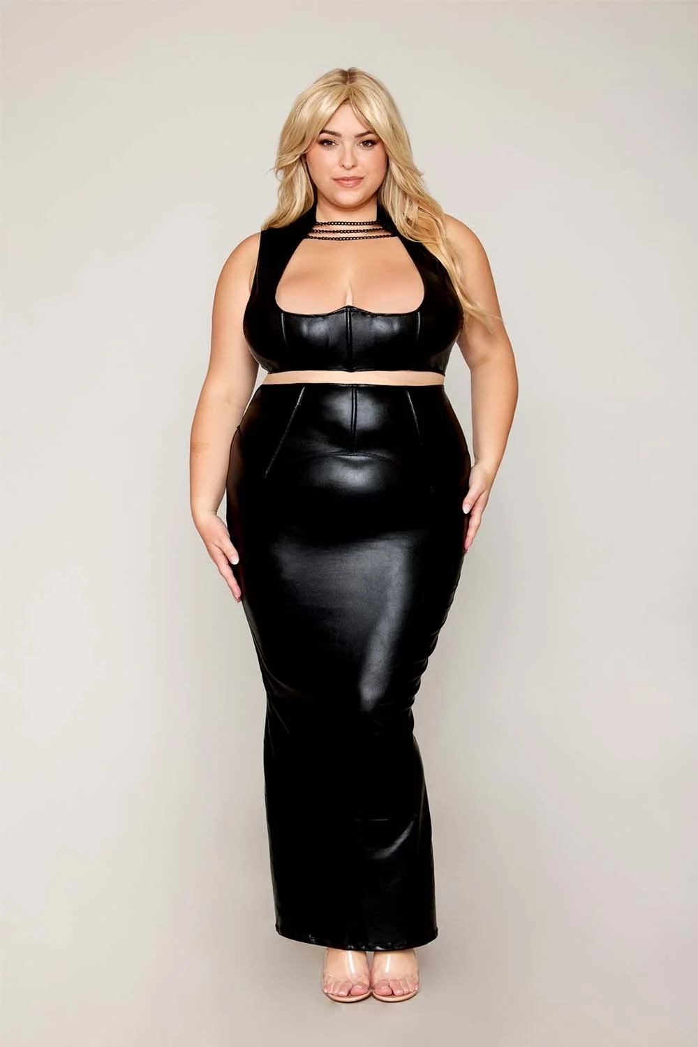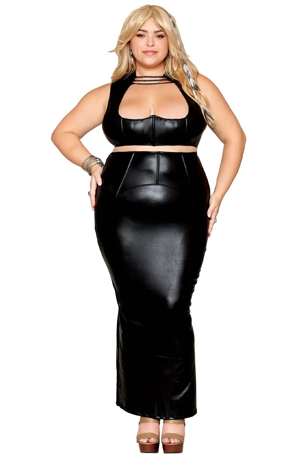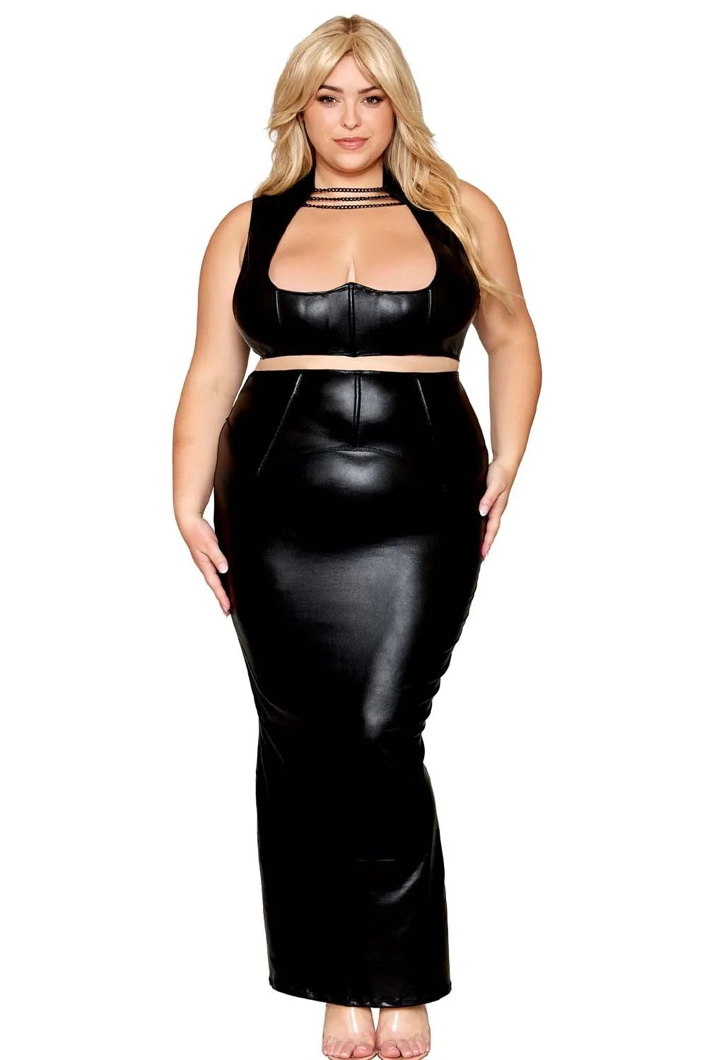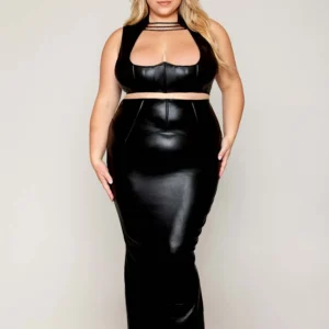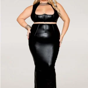 Set aus BH und langem Rock, große Größe, schwarz in Kunstleder – DG13198XBLK