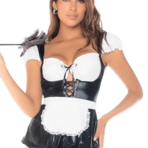 Spielen Sie die Karte der Verführung mit diesem sexy Zimmermädchen-Kostüm im gewagten Design. Es besteht aus einem rückenfreien Minikleid mit Schnürung vorne aus Stoff in Wetlook-Optik, verziert mit Netzrüschen, begleitet von einer abnehmbaren Schürze und einer Spitzenhaube für einen koketten und raffinierten Touch.