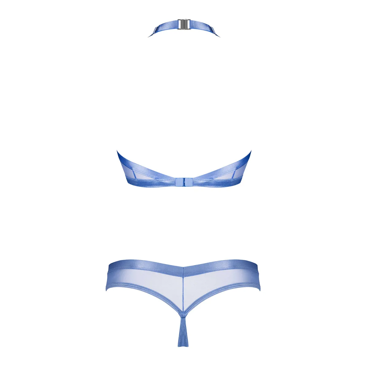Shaderi Top und StringEin blaues Dessous-Set aus hochwertigen und luxuriösen Stoffen, das ein angenehmes Tragegefühl bietet. Das Oberteil hat einen verführerisch offenen Rücken, der mit Haken und einem verstellbaren Riemen befestigt ist. Der asymmetrische String mit bequemen Rändern sorgt für eine schmeichelhafte Passform für jede Silhouette. Blaues Dessous-Set: Top und StringRiemen mit Verschluss am HalsVerstellbarer Verschluss hintenTransparenter Stoff und glänzende Verzierungen94% Polyamid, 6% ElasthanEntworfen in der EUnickelfrei