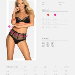 Nous avons un ensemble de lingerie qui fera palpiter le c?ur de votre moitié. L’ensemble Sharlotte est décoré d’une dentelle exceptionnellement accrocheuse. La culotte haute avec une coupe string est le compromis parfait pour le quotidien et les soirées sensuelles. Offrez-vous des moments de plaisir avec Obsessive… Secrets de cet ensemble: Culotte taille haute avec string coupé sur les fesses – look sexy Bretelles réglables Soutien-gorge doux avec armatures – offre un confort Pendentif décoratif L’ensemble comprend une culotte taille haute et un soutien-gorge Tissus doux Composition: 90% polyamide, 10% élasthanne
