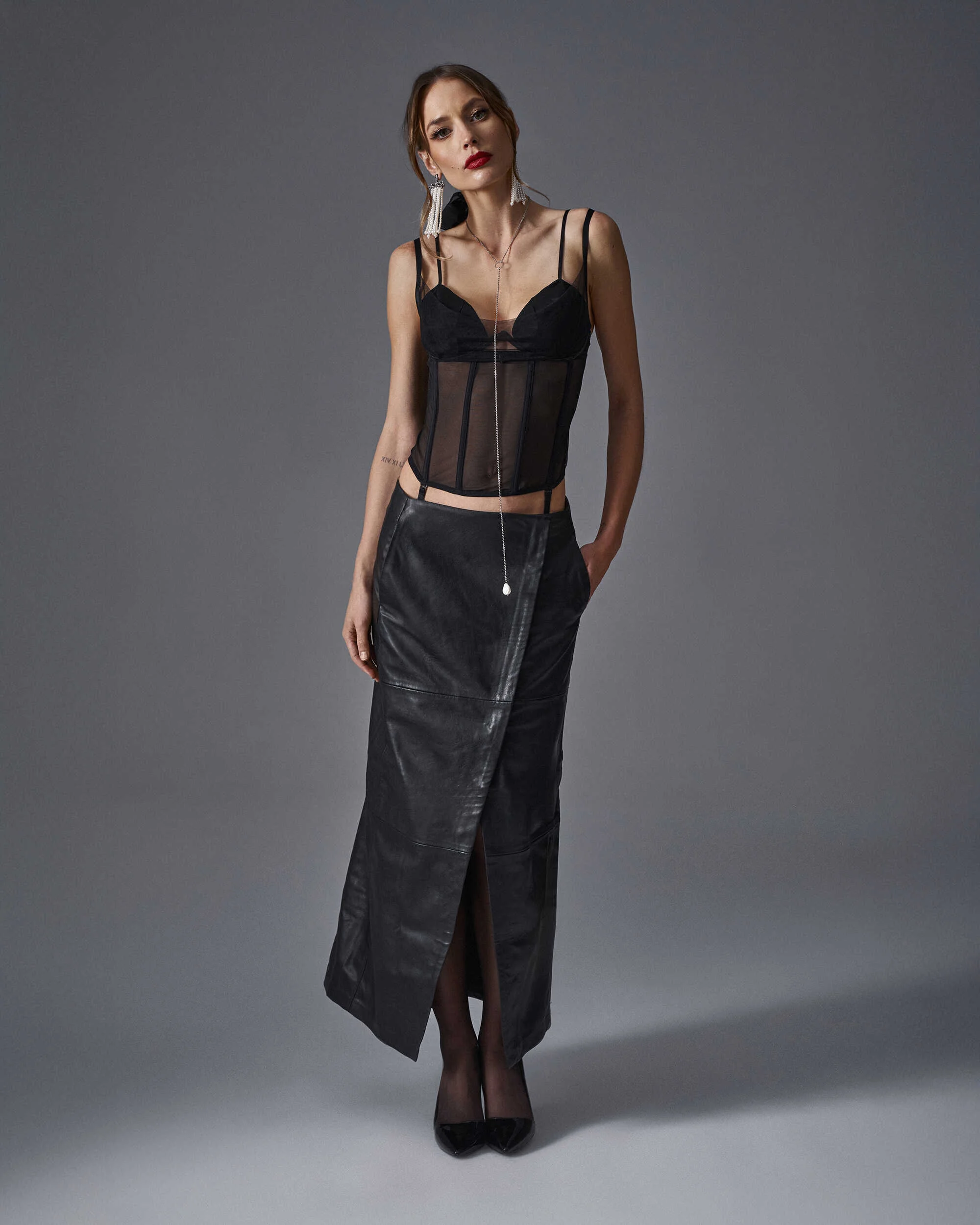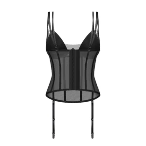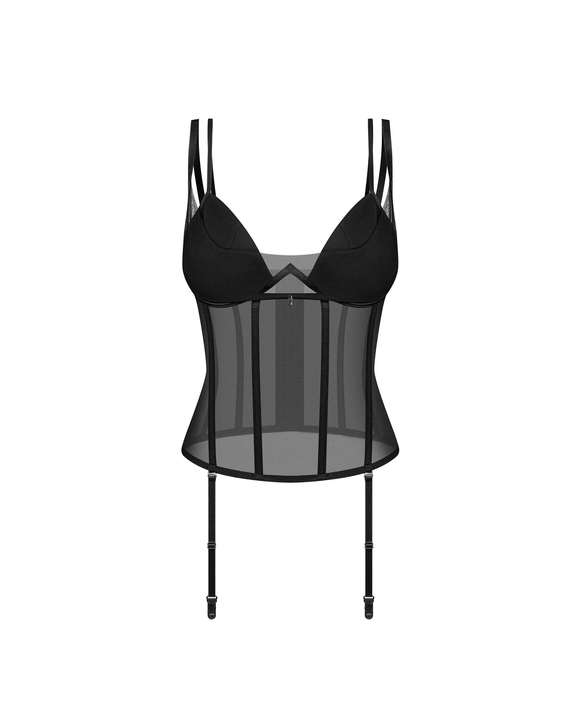 Corset SibilieUn corset en maille élastique à baleines verticales. Il est doté de bonnets rembourrés et de doubles bretelles réglables. Des bretelles amovibles et une fixation multi-étapes vous donnent la possibilité d?un réglage individuel.- corset en noir profond- maille élastique de qualité supérieure- double-couche de tulle sur le buste- cuvettes rembourrées et baleines verticales- bretelles réglables et bretelles amovibles- fermeture à plusieurs niveaux à l?arrière- pendentif minimaliste (sans nickel)- 94% polyamide, 6% élasthanne- conçu dans l?UECe produit ne convient pas aux enfants de moins de 3 ans en raison du risque d?étouffement sur les petites pièces qui peuvent se détacher du produit.