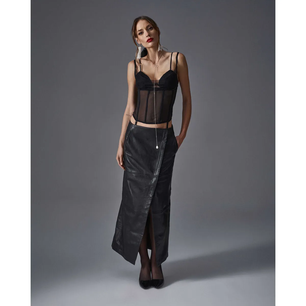 Korsett SibilieEin elastisches Netz-Korsett mit vertikalen Stäbchen. Es ist mit gepolsterten Körbchen und verstellbaren Doppelträgern ausgestattet. Abnehmbare Träger und ein mehrstufiger Verschluss ermöglichen eine individuelle Anpassung.- Korsett in tiefem Schwarz- hochwertiges elastisches Netz- doppellagiger Tüll auf der Brust- gepolsterte Körbchen und vertikale Stäbchen- verstellbare Träger und abnehmbare Träger- mehrstufiger Verschluss auf der Rückseite- minimalistischer Anhänger (nickelfrei)- 94% Polyamid, 6% Elasthan- entworfen in der EUDieses Produkt ist nicht für Kinder unter 3 Jahren geeignet, da Kleinteile, die sich vom Produkt lösen können, Erstickungsgefahr darstellen.