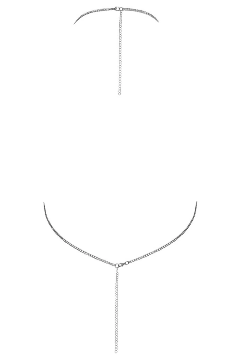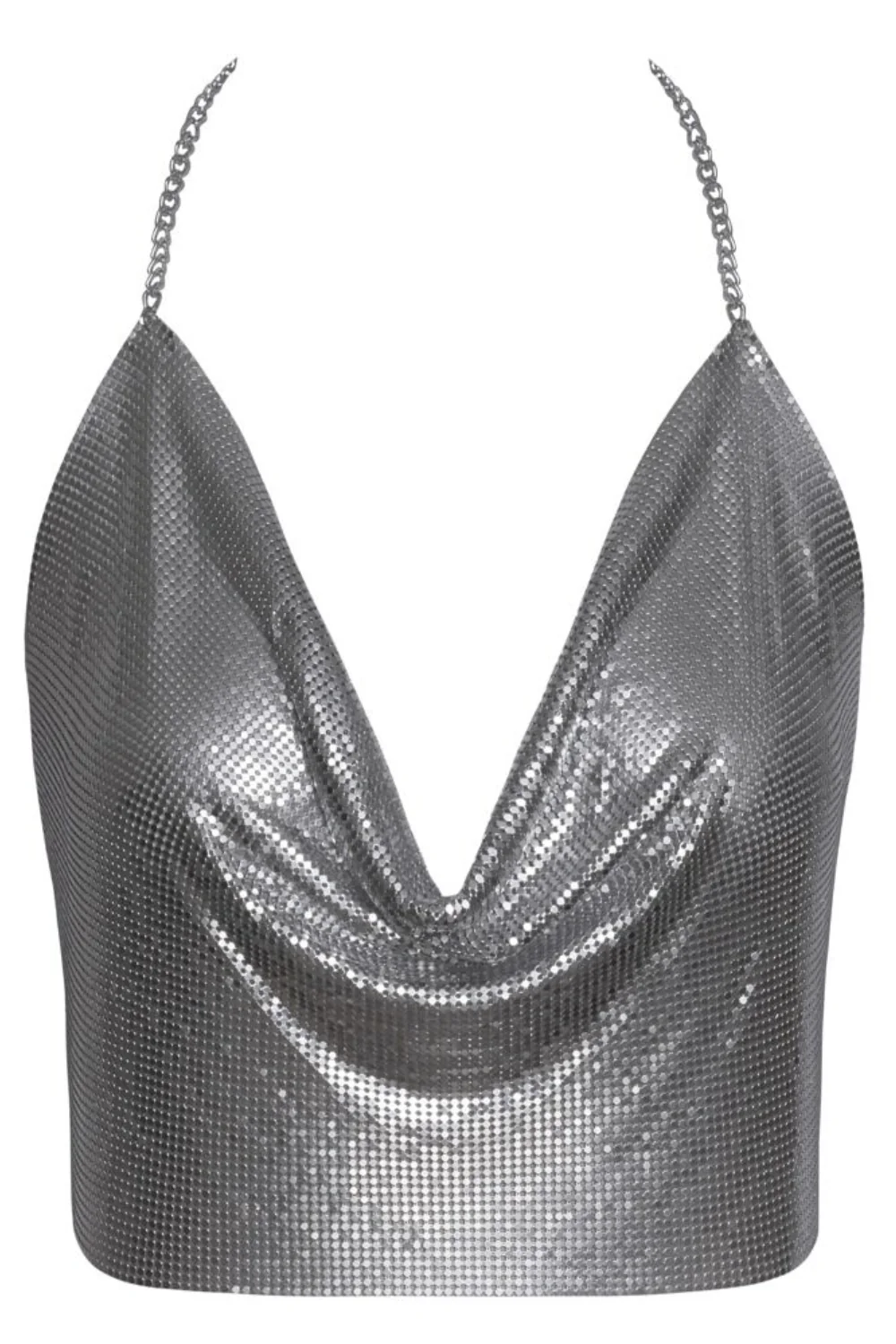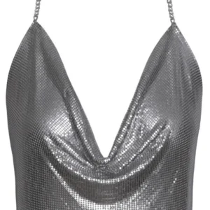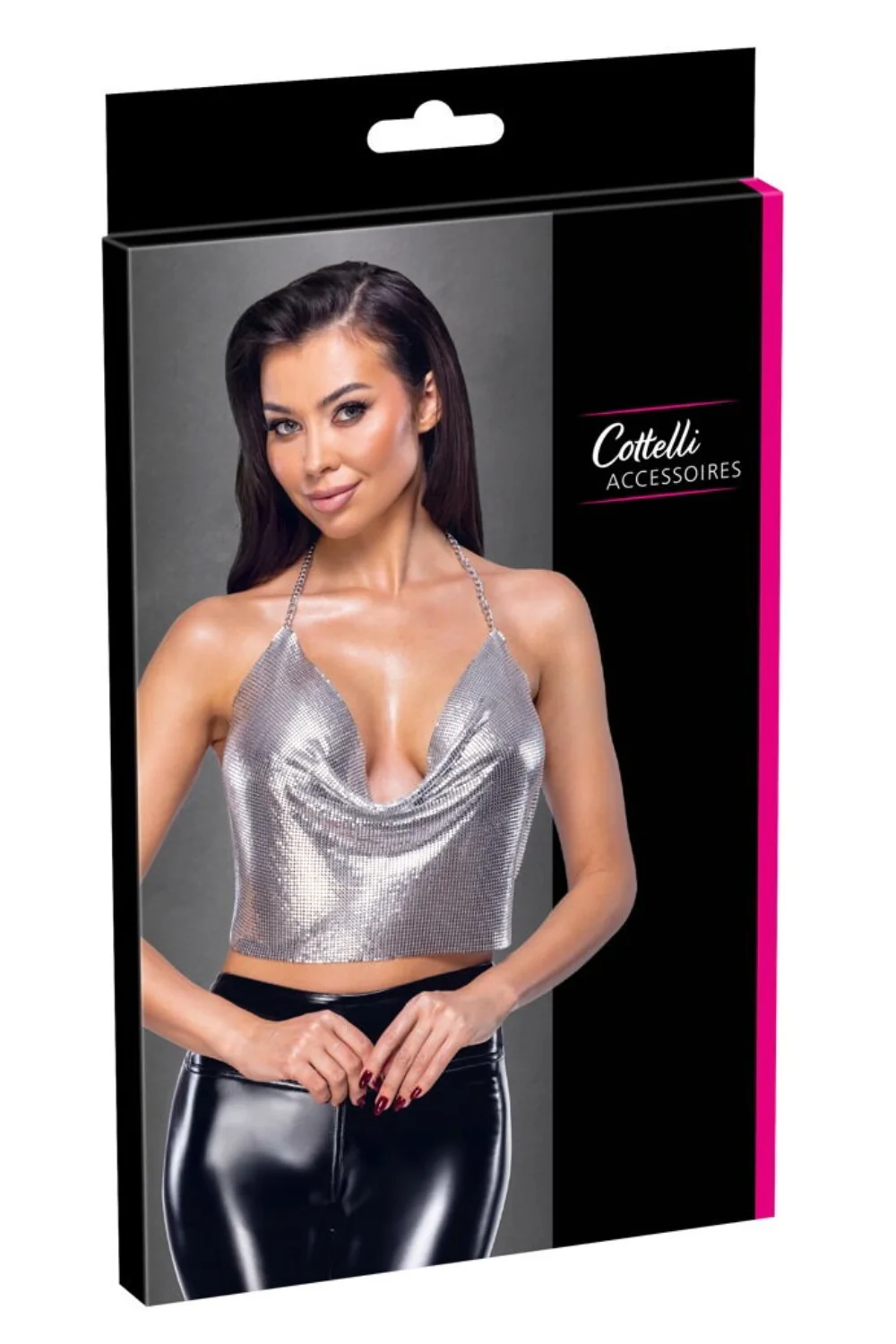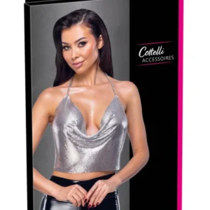 Sensationelles und glamouröses Oberteil mit diesem silbernen Metallic-Crop-Top von Cottelli ACCESSOIRES. Hergestellt aus schimmernden, weichen Metallplatten, besticht dieses Oberteil durch einen tiefen Wasserfall-Ausschnitt und einen ultra-sexy Rückenfrei-Schnitt. Perfekt für einen Abend, ein Event oder ein Bühnenoutfit, passt sich dieses Top dank zweier verstellbarer Ketten mit Karabinerverschluss perfekt an: eine um den Hals als Neckholder, die andere am unteren Rücken. Das Material schmiegt sich geschmeidig an die Kurven und bietet trotz seines metallischen Looks einen überraschend angenehmen Tragekomfort.