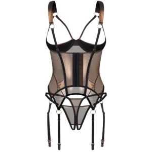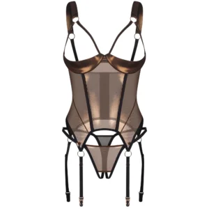 Corset Soranna & string sans crochetUn corset aux tons dorés combinant une maille transparente avec un scintillement subtil et un design moulant. Le corset à baleines sculpte visuellement la silhouette, met en valeur la taille et rehausse le buste, tandis que les coutures verticales créent un effet amincissant. Des lanières en jarretelles ajustables complètent le look, et le string ouvert ajoute une touche audacieuse et provocante.- ensemble de deux pièces ? corset et string sans crochet- les armatures et le façonnage vertical du désossage- fermeture dos style corset- bretelles en jarretelles ajustables- une maille transparente avec un éclat doré- matière : 95% polyester, 5% élasthanne- conçu dans l?UECe produit ne convient pas aux enfants de moins de 3 ans ? risque d?étouffement en raison des petites pièces qui peuvent être détachées du produit.
