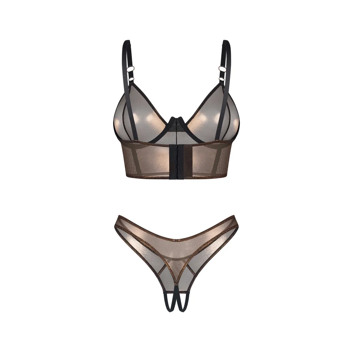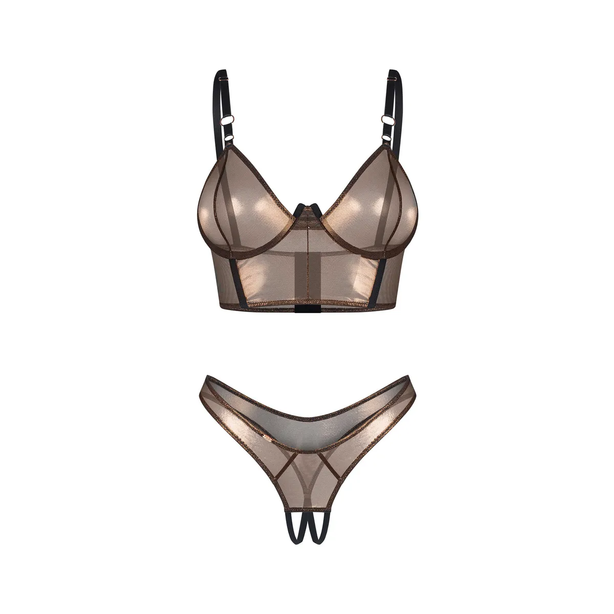 Soranna Top & offener StringZweiteiliges Set aus goldenem Netz mit transparentem Finish. Der Bügel-BH hebt die Brust hervor, während der offene String im Schritt Kühnheit verleiht und einen provokanten Höhepunkt des Sets schafft.- zweiteiliges Set – BH und offener String- Verkabelung unter der Brust und vertikale Verstärkung für optische Formgebung- verstellbarer Verschluss und Träger- transparentes Netz mit goldenem Glanz- elastisches Gewebe für perfekte Passform: 95% Polyester, 5% Elasthan- entworfen in der EUDieses Produkt ist nicht für Kinder unter 3 Jahren geeignet – Erstickungsgefahr aufgrund kleiner Teile, die sich vom Produkt lösen können.