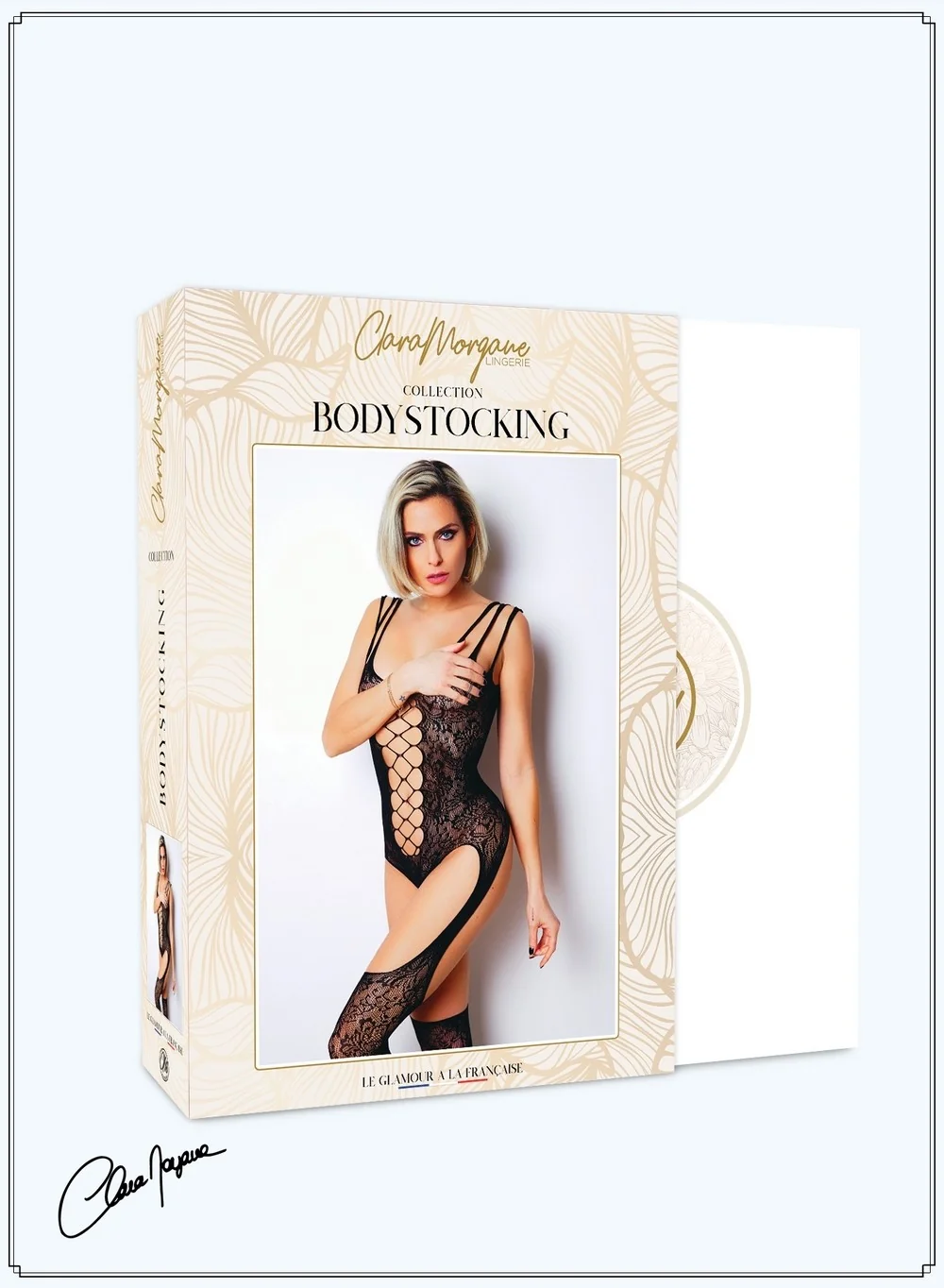 Bodystocking, Clara Morgane, aus floraler Spitze und dreifachen Trägern, mit gekreuzten Riemen am Bauch. Im Schritt geschlossen. Es ist mit sehr verführerischen Strumpfhaltern verbunden. Weich und dehnbar, wird dieser sexy Anzug perfekt die Kurven Ihres Körpers umschmeicheln. Zusammensetzung: 92% Polyamid und 8% Elasthan