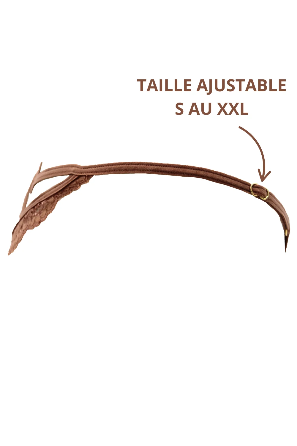 Betonen Sie Ihre Sinnlichkeit mit diesem taupefarbenen String aus raffinierter Spitze, veredelt durch ein goldenes Herzschmuckdetail auf der Rückseite, das eine romantische und glamouröse Note hinzufügt. Sein offenes Design und die verstellbaren Riemen betonen die Silhouette und bieten gleichzeitig eine perfekte Passform und optimalen Komfort. Produktdetails: ✔ Feine und zarte Spitze für einen femininen und verführerischen Look. ✔ Herzschmuckdetail in Gold auf der Rückseite für eine wertvolle und elegante Note. ✔ Verstellbare Riemen, die eine ideale Anpassung an alle Körperformen ermöglichen. ✔ Minimalistischer & sexy Schnitt, ideal für raffinierte und gewagte Dessous. Einheitsgröße verstellbar von S bis XXL Pflegehinweise: Handwäsche in lauwarmem Wasser mit mildem Seifenmittel, um die Spitze zu schonen und den Schmuck nicht zu beschädigen. Bei Maschinenwäsche verwenden Sie ein Wäschenetz und einen Schonwaschgang bei niedriger Temperatur. Vermeiden Sie den Trockner, bevorzugen Sie das Lufttrocknen auf einer flachen Oberfläche, um Form und Elastizität zu erhalten. Material: 90% Polyamid 10% Elasthan