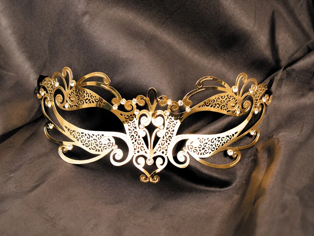 Venezianische Maske Gaia, starr, golden mit Strasssteinen. Befestigung mit Bändern. Eine hochwertige Maske für Ihre Kostüm- oder sinnlichen Abende. Material: Metall und Strasssteine.