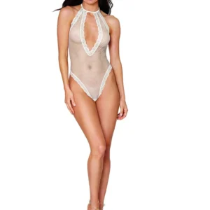 Weißer Body aus Netz und Spitze mit Perlen am Rücken – DG12832WHT
