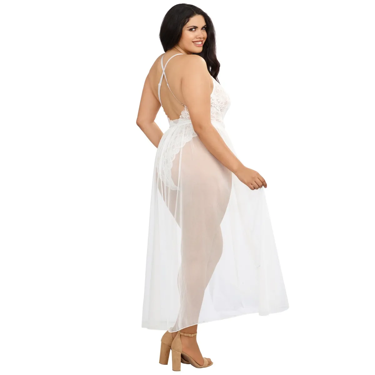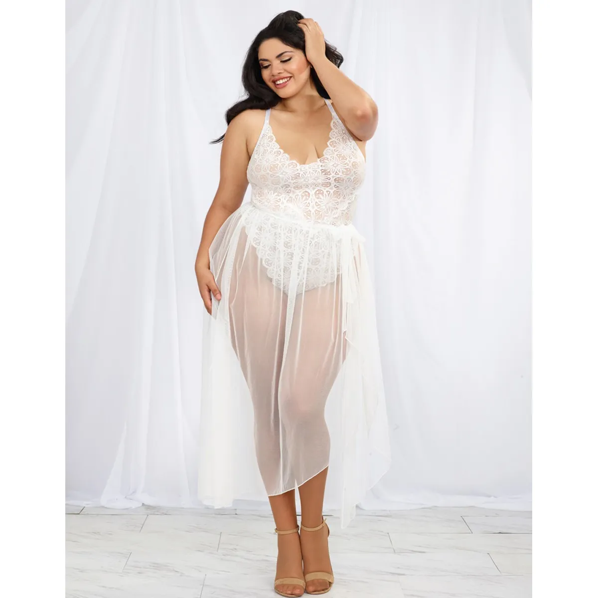 Weißer Body in großer Größe mit Spitzenbesatz, hoch ausgeschnitten, mit abnehmbarem transparentem Netzrock – DG10996XWHT