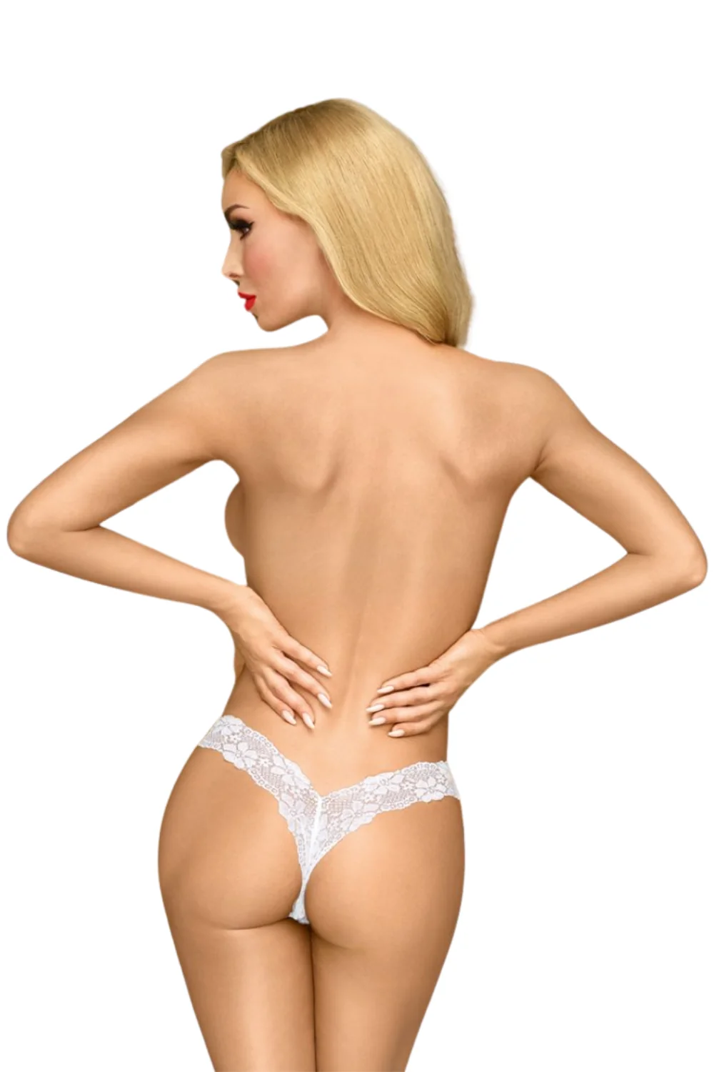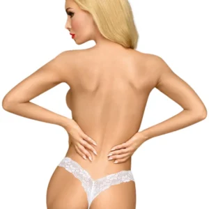 Weiße florale Spitzenstring in sehr sexy V-Schnitt. Verziert mit einer kleinen rosa Satinschleife vorne. Zusammensetzung: 90% Polyamid, 10% Elasthan