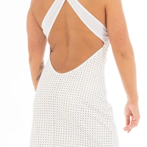 Kurzes weißes Kleid aus Kunstleder, breite Träger vorne und hinten gekreuzt. Wunderschön rückenfrei. Sinnlicher Abend für ein Dinner zu zweit. Weißes Kleid aus Kunstleder mit vorne gekreuzten Trägern. Materialien: 100% Polyester