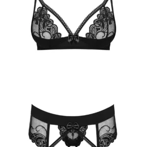 Adorable ensemble sexy noir de 3 pièces. Vous serez charmées de son soutien-gorge dans un style push-up sublimé d’une dentelle raffinée. Ses ornements de poitrine bordés de dentelle vont considérablement embellir votre décolleté et un joli neoud satin se trouve entre les seins. Bretelles et accroche réglables. Un porte-jarretelles de toute beauté avec dentelle sur les jarretelles et petit noeud satin. String assorti fourni, la composition est 90% polyamide 10% elasthanneDécouvrir toute la collection de lingerie sexy Wonderia Obsessive