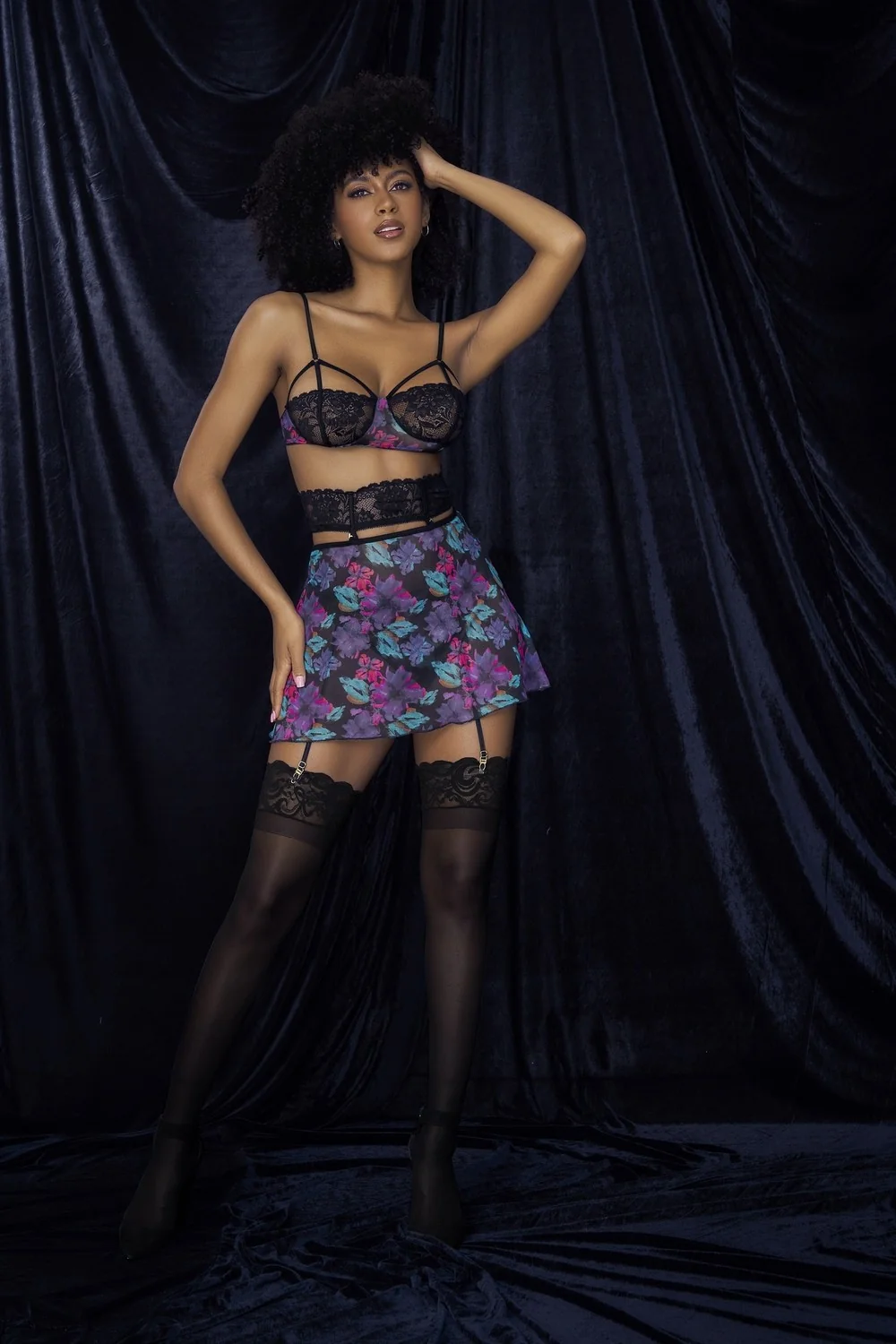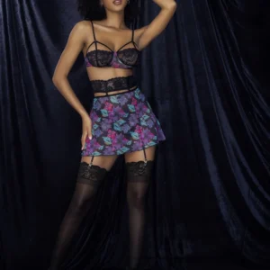 Romantik und Vielseitigkeit in einem wandelbaren Negligé, das einen Spitzen-BH mit Blumenmuster und verstellbaren Trägern, einen Spitzen-Strumpfhalter und den dazu passenden String enthält. Ein abnehmbarer Rock macht dieses dreiteilige Set zu einem wunderschönen sexy Negligé. Zusammensetzung: 78% Polyester 22% Elasthan/86% Polyamid 14% Elasthan