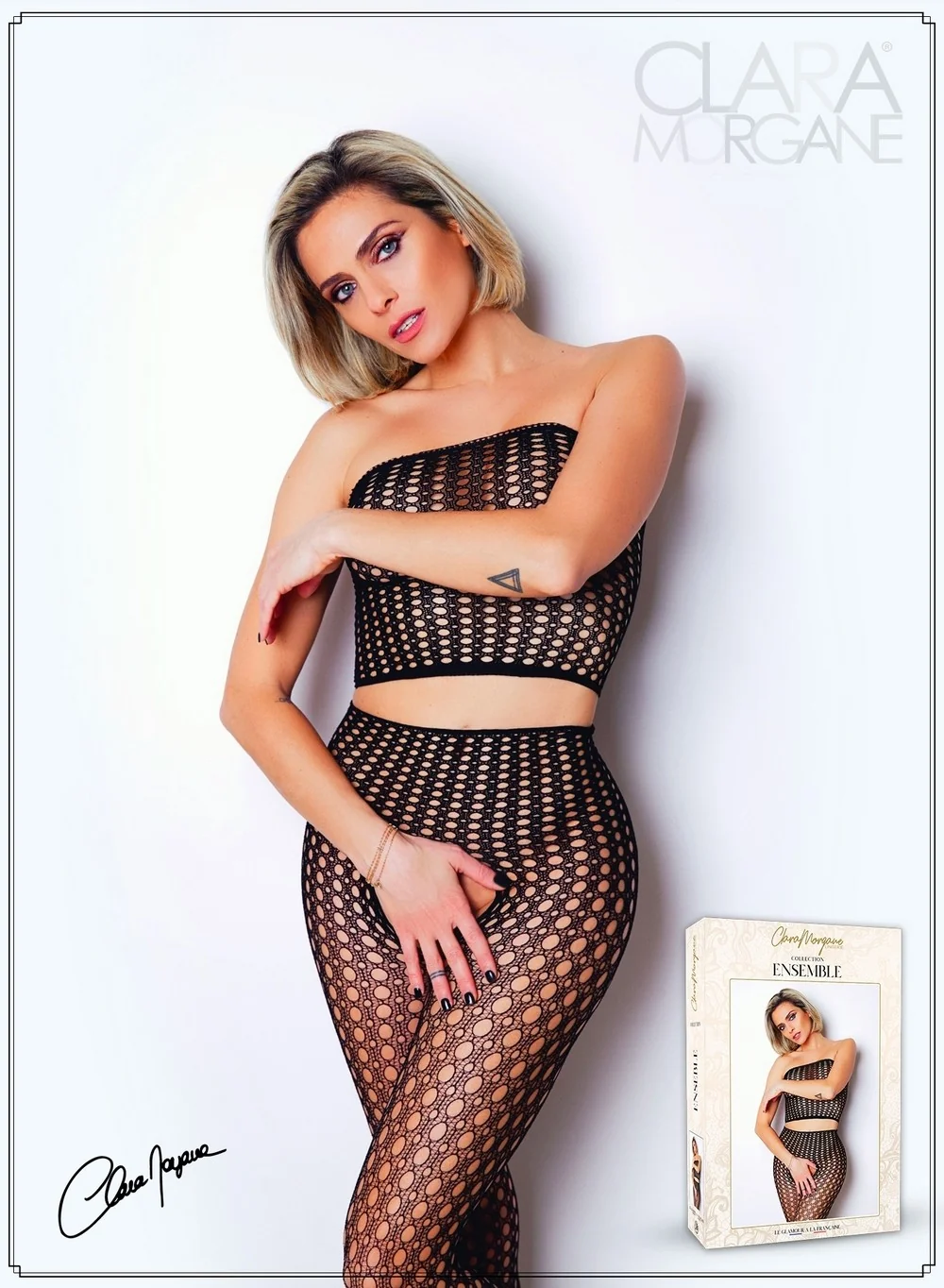 Zweiteiliges Set aus feinem Netzgewebe, das aus einem Bandeau-Top besteht, das Ihre Büste betont, und einem hoch taillierten Unterteil, das Ihre Taille und Hüften hervorhebt. Es verfügt über eine Öffnung im Schritt für noch mehr Charme und Glamour. Der durchbrochene, weiche und sehr dehnbare Stoff betont Ihre Kurven. Zusammensetzung: 92% Polyamid und 8% Elasthan