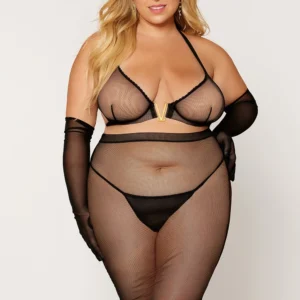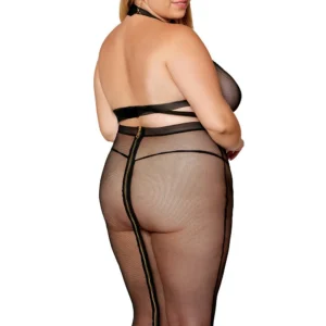 Sexy 2-teilige Set. Große Größe (G-String und Handschuhe nicht inbegriffen), mit seinem transparenten schwarzen Netz-BH und dicken Trägern, einem Hakenverschluss, einem goldenen „V“-Draht vorne und einem Hakenverschluss hinten, aus der Dreamgirl-Kollektion. Rock mit einem goldenen Reißverschluss hinten. Zusammensetzung: BH / Langer Sliprock: Netz: 88% Nylon 12% Spandex, Elastisches Band: 75% Spandex 25% Nylon / Pflegehinweis: Handwäsche in kaltem Wasser, nicht im Trockner trocknen