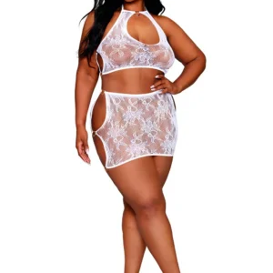 Zweiteiliges Set in großen Größen, bestehend aus einem Oberteil und einem Rock aus floraler Netzspitze, an den Hüften ausgeschnitten. Zusammensetzung: Bralette/Rock: 90% Nylon, 10% Spandex; exklusive Dekoration. Pflegehinweis: Von Hand in kaltem Wasser waschen, kein Bleichmittel verwenden, nicht im Trockner trocknen.