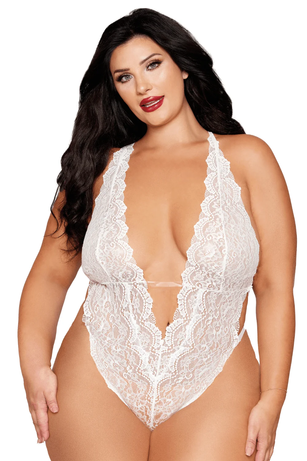 Zweiteiliges Set in großer Größe, weißer Spitzenbody und Körperkettchen mit weißen Perlen – DG13697XWHT